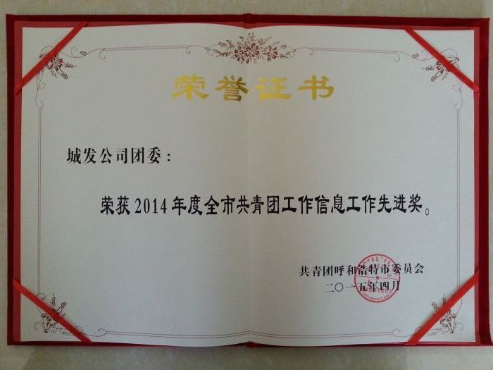 201543,在共青團(tuán)呼和浩特市十六屆二次全委(擴(kuò)大)會暨少工委五屆五次全委(擴(kuò)大)會議上,城發(fā)公司團(tuán)委榮獲“2014年度全市共青團(tuán)工作信息工作先進(jìn)獎”。