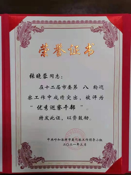 城發(fā)公司張曉蓉同志 榮獲“市委第八輪巡察優(yōu)秀巡察干部”榮譽稱號