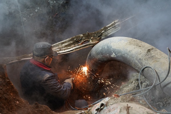 "找到啦!"隨著一聲驚呼,一條約20公分長(zhǎng)的裂口,赫然出現(xiàn)在人們面前。雖然當(dāng)時(shí)已經(jīng)是晚上8點(diǎn)多,室外的氣溫也在持續(xù)下降,為了盡快恢復(fù)供熱,大家沒有休息,馬不停蹄的開始了緊張的堵漏工作。經(jīng)過一夜的奮戰(zhàn),終于在23日早6點(diǎn)半結(jié)束搶修,開始注水。在停暖15個(gè)小時(shí)后,恢復(fù)正常供熱,確保了62萬平米內(nèi)的熱用戶家中溫度及時(shí)上升。