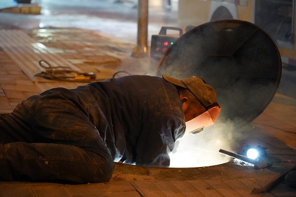 坑里挖的熱火朝天,坑外的工作人員也不停歇的忙著。在距離開挖點(diǎn)2米的一個(gè)管道井,一位師傅正趴在井口旁邊,上半身倒栽在進(jìn)井口,焊接著距離井口半米遠(yuǎn)的排氣閥門,筆者站在遠(yuǎn)處,都能聞到濃濃的電焊味道,而作業(yè)的師傅也被電焊產(chǎn)生的煙氣嗆得不停的流眼淚,時(shí)不時(shí)地從井口起身換口氣。