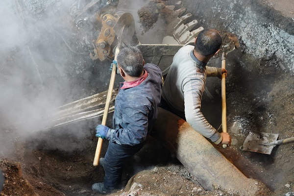 筆者于晚間6:00抵達(dá)搶修現(xiàn)場(chǎng)時(shí),大老遠(yuǎn)地就看見沿路的井蓋都冒著白色的水蒸氣,進(jìn)入搶修現(xiàn)場(chǎng),筆者看到,橋靠分公司總經(jīng)理阮強(qiáng)、副總經(jīng)理張國良、運(yùn)營四所所長(zhǎng)馮俊及公用事業(yè)管理局相關(guān)領(lǐng)導(dǎo)在現(xiàn)場(chǎng)緊鑼密鼓地指揮著搶修?,F(xiàn)場(chǎng)兩個(gè)搶修師傅正在一個(gè)10平方米、2米多深的大坑中,一鍬一鍬地奮力挖著坑內(nèi)的土,現(xiàn)場(chǎng)工作人員介紹到,因?yàn)橐呀?jīng)接近管道,為確保管道的安全,目前只能人工挖掘。當(dāng)時(shí)的室外溫度在-11℃,工人們卻是滿頭大汗。