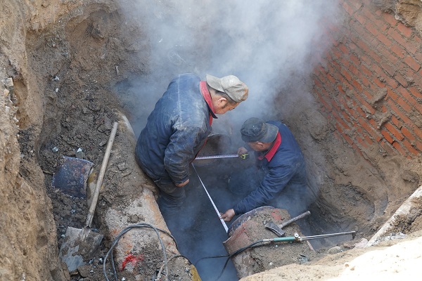 據(jù)悉,此次出現(xiàn)故障的是DN350管線,搶修需在泄水泄壓停暖的狀態(tài)下進行,該管道為供水管道,管內熱水溫度高達90多度,這也加大了搶修難度。"為確保此次受影響的65萬平米熱用戶能夠及早恢復供熱,金橋分公司馬不停蹄地連夜施工,進行搶修。"王永彪說。