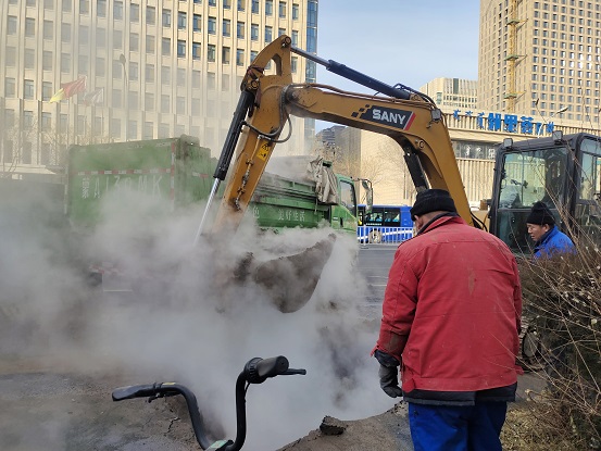 在鄂爾多斯東街龍谷華庭和銀聯(lián)大廈樓前臨街道路欄桿旁,緊靠人行道的一臺(tái)挖掘機(jī)正發(fā)出轟鳴聲,地溝內(nèi)不斷冒出騰騰熱氣這是1月2日下午15:00,在該地段搶修一次管網(wǎng)的畫面。當(dāng)日,熱心市民發(fā)現(xiàn)該處路段人行道有熱水冒出。城發(fā)橋靠分公司第六運(yùn)營(yíng)所工作人員接到熱線通知后,立即趕往現(xiàn)場(chǎng)。經(jīng)測(cè)水溫為74℃,確定為一次網(wǎng)漏水。所長(zhǎng)耿焱立即逐級(jí)上報(bào),并安排所部人員對(duì)漏點(diǎn)進(jìn)行現(xiàn)場(chǎng)安全防護(hù),同時(shí)對(duì)漏點(diǎn)情況進(jìn)行觀察。