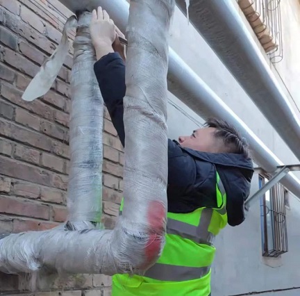 "咱們先把這段管網(wǎng)的巖棉扒了,都戴上手套,別扎著"初二中午12點(diǎn),筆者在云鼎所車站西街華聯(lián)超市倉(cāng)庫(kù)內(nèi)看到新華西分公司檢修所李明和工作人員正在查找跑水點(diǎn),他說:"11:30接到電話反映這里二次管網(wǎng)跑水,我就趕緊帶著工作人員過來了,由于這個(gè)管網(wǎng)的保溫是巖棉,很扎人,我們處理的時(shí)候得小心一些。"沒過一會(huì)兒他們就在DN80二次管網(wǎng)上找到了跑水點(diǎn),為了不影響正常供熱,李明決定帶水帶壓用打卡子的方式封堵漏點(diǎn),經(jīng)過半個(gè)多小時(shí)的作業(yè),搶修完成。李明告訴筆者:"春節(jié)對(duì)于我們來說和平時(shí)一樣,我來富泰熱力工作了20年了,年年如此,也希望和家里人一起過個(gè)春節(jié),可是我們要是休息了,用戶家里用熱方面有什么事兒怎么辦,工作性質(zhì)就是這樣,既然選擇了這份工作,我就得把它做好。"