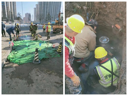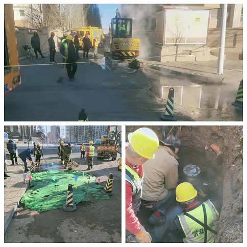 大年初二這天早上,富泰熱力公司巴彥分公司廠區(qū)門口路面滲水,疑似一次網(wǎng)發(fā)生跑水。得知這一情況后,分公司檢修所工作人員在對跑水位置進行初步判斷后,立即聯(lián)系了安裝分公司。嚴陣以待的安裝分公司搶修隊員第一時間趕往現(xiàn)場,發(fā)現(xiàn)現(xiàn)場有配電箱,地下有電纜、天然氣管,機械開挖比較危險,于是人工對路面進行開挖,進一步尋找漏點。經(jīng)過查找,發(fā)現(xiàn)是一次網(wǎng)上一個50抽頭發(fā)生跑水,他們不顧刺骨寒風(fēng)帶水作業(yè),給抽頭焊接了一個150的套管,又在套管上安裝了一個150的法蘭球閥,等做好保溫回填地面后,已經(jīng)是第二天凌晨4點了。大年初五,安裝分公司又接到了左右城小區(qū)跑水搶修任務(wù)。由于施工難度較大,搶修隊員們一刻不停歇的干了一天才完成任務(wù),及時恢復(fù)了供暖。