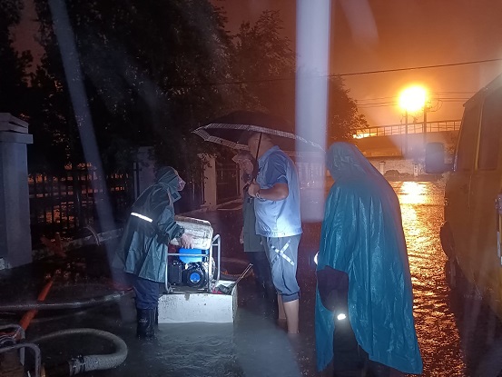橋靠分公司組織員工們先將防汛沙袋置于地勢較低的單元門口,將水泵置于地勢最低處做好了防汛排水的準(zhǔn)備工作。為了確保人民群眾的生命財(cái)產(chǎn)安全,在做好前期準(zhǔn)備工作后,大家便守在現(xiàn)場,密切關(guān)注天氣情況,實(shí)時監(jiān)測雨情汛情,雖然白天的天空還能看到藍(lán)天白云,但他們堅(jiān)守崗位絲毫不敢松懈,只是買了盒飯靠在車旁簡單的解決了溫飽。13日夜間22時,隨著雨量的加大及降雨的持續(xù),小區(qū)內(nèi)地勢低洼處排水量開始小于降水量,積水深度開始上漲。此時天空就像是開啟了“水簾洞”模式,穿著雨衣依舊全身濕透的防汛職工們冒著雨淌著水一遍遍的查看,按照防汛作業(yè)預(yù)案開展工作,他們始終堅(jiān)守一線在暴雨中逆行,全力以赴守護(hù)轄區(qū)群眾安危。