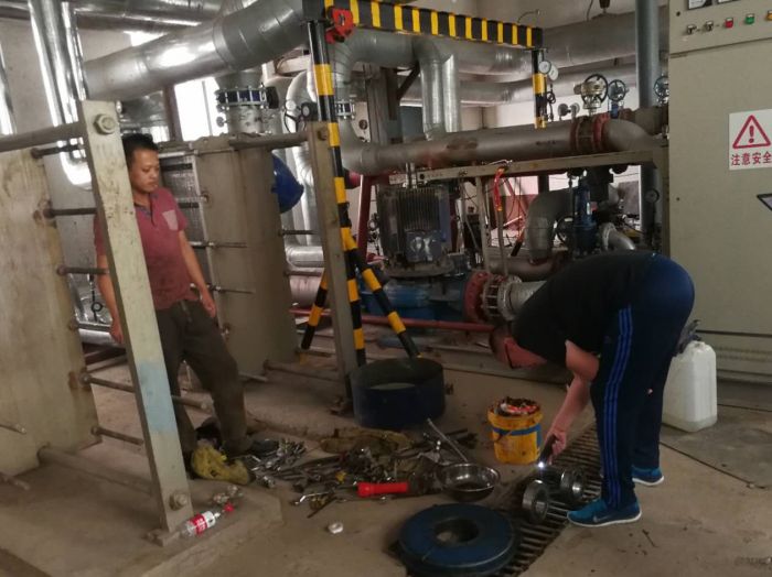 第一站為運營二所儲運熱力站,站內(nèi)一派忙碌的檢修景象,檢修人員正在拆解75KW循環(huán)泵。據(jù)運營二所檢修助理尚帥介紹,此臺循環(huán)泵于2005年投入使用,運行期間,可供儲運小區(qū)、會計學(xué)校、煤炭大廈、以及中華家園一期等居民用熱。在拆解過程中發(fā)現(xiàn)循環(huán)泵電機線包有燒焦處并且發(fā)黑,電機端蓋也磨損嚴重。副經(jīng)理劉強仔細查看,囑咐二所人員針對老、舊設(shè)備工況應(yīng)及時采購更換以保證冬季采暖期熱用戶的用熱保障。隨后,前往運營三所恒大G區(qū)熱力站進行安全檢查,站內(nèi)檢修人員正在清洗除污器。