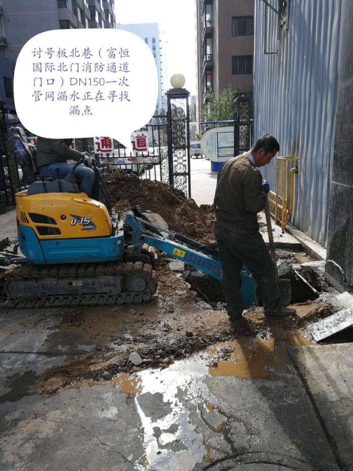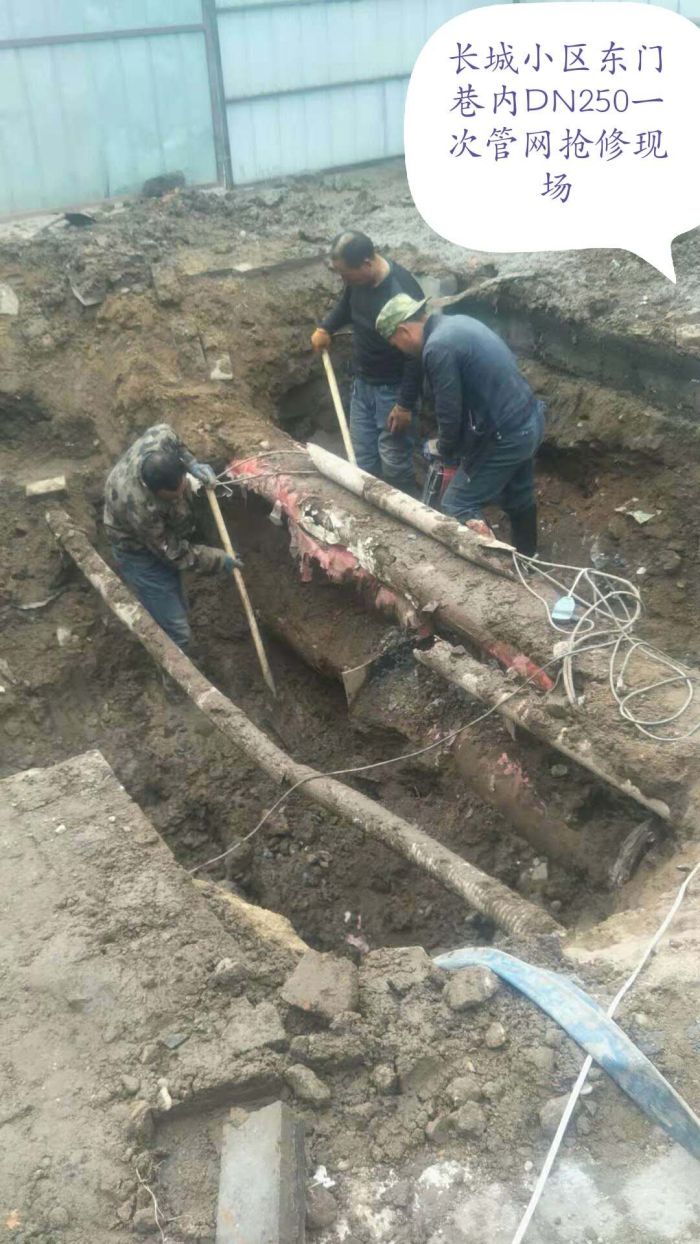 9月29日,管網(wǎng)公司接到辛家營供熱分公司搶修通知,騰飛南路如意廣場環(huán)形路口北側(cè)東綠化帶中發(fā)現(xiàn)一處冒水現(xiàn)象。管網(wǎng)公司領導高度重視,迅即安排人手,查找漏水點。他們憑借豐富的搶修經(jīng)驗,決定采用十字釘,直架設于涵管之上,創(chuàng)造人工作業(yè)通道,根據(jù)涵管內(nèi)水流方向判斷,搶修人員在胸腹部綁上滑板及護具,在DN600熱力管道中向西滑行50米左右,終于發(fā)現(xiàn)了漏水點。為了給供暖投運工作贏取時間,參與搶修的20余人輪班作業(yè),連續(xù)奮戰(zhàn)7個晝夜,10月6日,圓滿完成搶修任務。