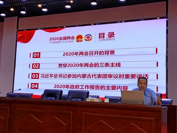 孫忠輝副教授以2020年全國兩會精神為專題,分別對2020年兩會召開的背景、貫穿2020年兩會的三條主線、習(xí)近平總書記參加內(nèi)蒙古代表團(tuán)審議時重要講話、2020年政府工作報告的主要內(nèi)容做了深入的解讀與細(xì)致的講解。兩會號召全國各族人民要更加緊密地團(tuán)結(jié)在以習(xí)近平同志為核心的黨中央周圍,高舉中國特色社會主義偉大旗幟,以習(xí)近平新時代中國特色社會主義思想為指導(dǎo),全面貫徹黨的十九大和十九屆二中、三中、四中全會精神,堅決貫徹黨的基本理論、基本路線、基本方略,增強“四個意識”、堅定“四個自信”、做到“兩個維護(hù)”,緊扣全面建成小康社會目標(biāo)任務(wù),統(tǒng)籌推進(jìn)疫情防控和經(jīng)濟(jì)社會發(fā)展工作,在疫情防控常態(tài)化前提下,堅持穩(wěn)中求進(jìn)工作總基調(diào),堅持新發(fā)展理念,堅持以供給側(cè)結(jié)構(gòu)性改革為主線,堅持以改革開放為動力推動高質(zhì)量發(fā)展,堅決打好三大攻堅戰(zhàn),加大“六穩(wěn)”工作力度,全面落實“六保”任務(wù),堅定實施擴(kuò)大內(nèi)需戰(zhàn)略,維護(hù)經(jīng)濟(jì)發(fā)展和社會穩(wěn)定大局,同心協(xié)力,攻堅克難,銳意進(jìn)取,確保完成決戰(zhàn)決勝脫貧攻堅目標(biāo)任務(wù),全面建成小康社會。同時闡明了中華民族向來不畏艱難險阻、當(dāng)代中國人民有戰(zhàn)勝任何挑戰(zhàn)的堅定意志和能力。